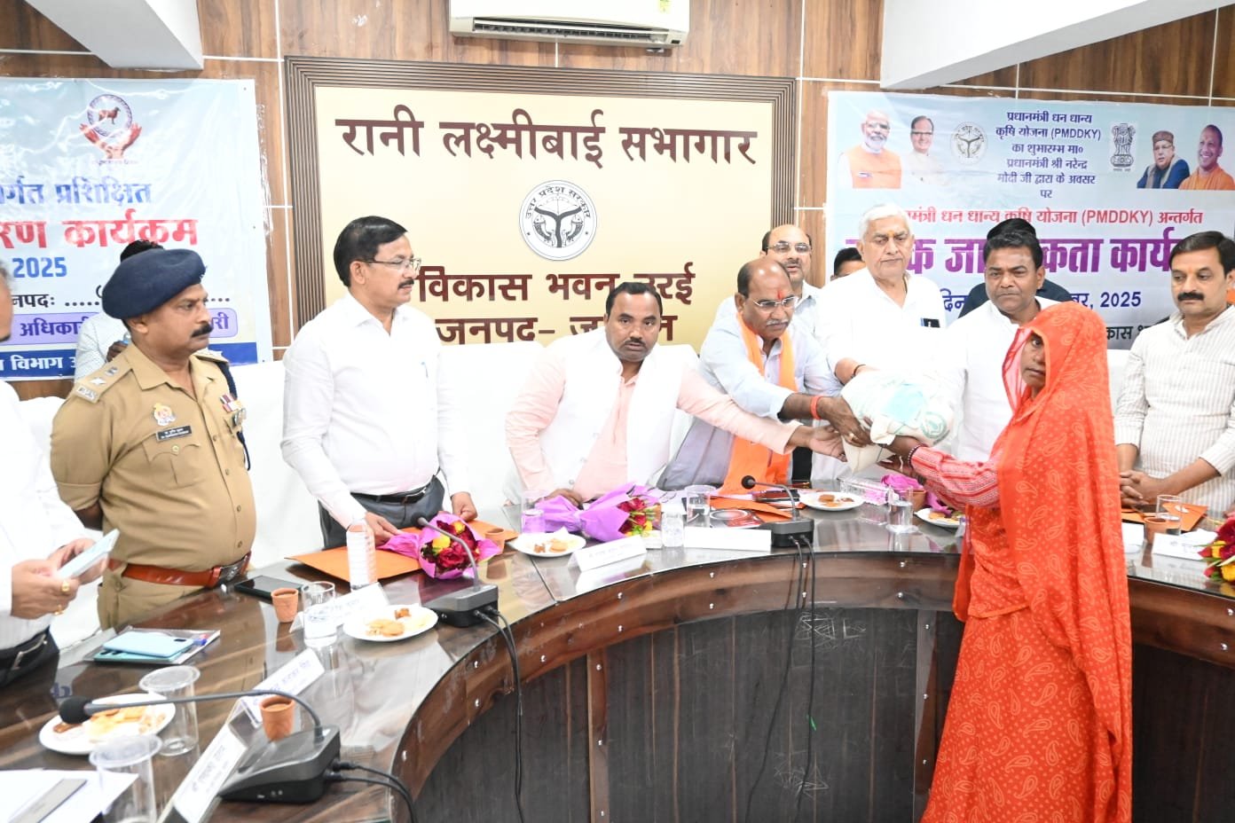 उरई जालौन। आज प्रधानमंत्री जी द्वारा नई दिल्ली से प्रधानमंत्री कृषि धन–धान्य योजना का भव्य शुभारंभ किया गया। इस महत्वाकांक्षी योजना में देश के 100 जनपदों का चयन किया गया है, जिनमें उत्तर प्रदेश के 12 जनपद शामिल हैं। विशेष रूप से बुंदेलखंड क्षेत्र के सभी जनपद इस योजना में सम्मिलित किए गए हैं। यह योजना आकांक्षी विकासखंडों की तर्ज पर कन्वर्जेंस आधारित होगी, जिसमें विभिन्न विभागों की 36 योजनाओं का समन्वय किया गया है। जनपद जालौन में योजना शुभारंभ के अवसर पर रानी लक्ष्मीबाई सभागार, विकास भवन में सजीव प्रसारण का आयोजन किया गया। कार्यक्रम में जिला पंचायत अध्यक्ष डॉ. घनश्याम अनुरागी, सदर विधायक गौरीशंकर वर्मा, माधौगढ़ विधायक मूलचंद निरंजन, कालपी विधायक विनोद चतुर्वेदी, जिलाधिकारी राजेश कुमार पाण्डेय, मुख्य विकास अधिकारी के.के. सिंह व जल शक्ति मंत्री के प्रतिनिधि अरविंद चौहान सहित जनपद के वरिष्ठ अधिकारी व जनप्रतिधि उपस्थित रहे। सजीव प्रसारण के दौरान लगभग 180 किसानों ने योजना की जानकारी एवं प्रधानमंत्री जी का संबोधन देखा-सुना। कार्यक्रम के अंत में किसानों को बीज किट वितरित की गईं तथा प्रगतिशील किसानों को प्रमाण पत्र प्रदान किए गए। इसी प्रकार जनपद के समस्त विकासखंडों में भी इस योजना के शुभारंभ अवसर पर कार्यक्रम आयोजित किए गये। जिनमें बड़ी संख्या में किसानों ने सहभागिता की और योजना से जुड़ने के प्रति उत्साह व्यक्त किया।